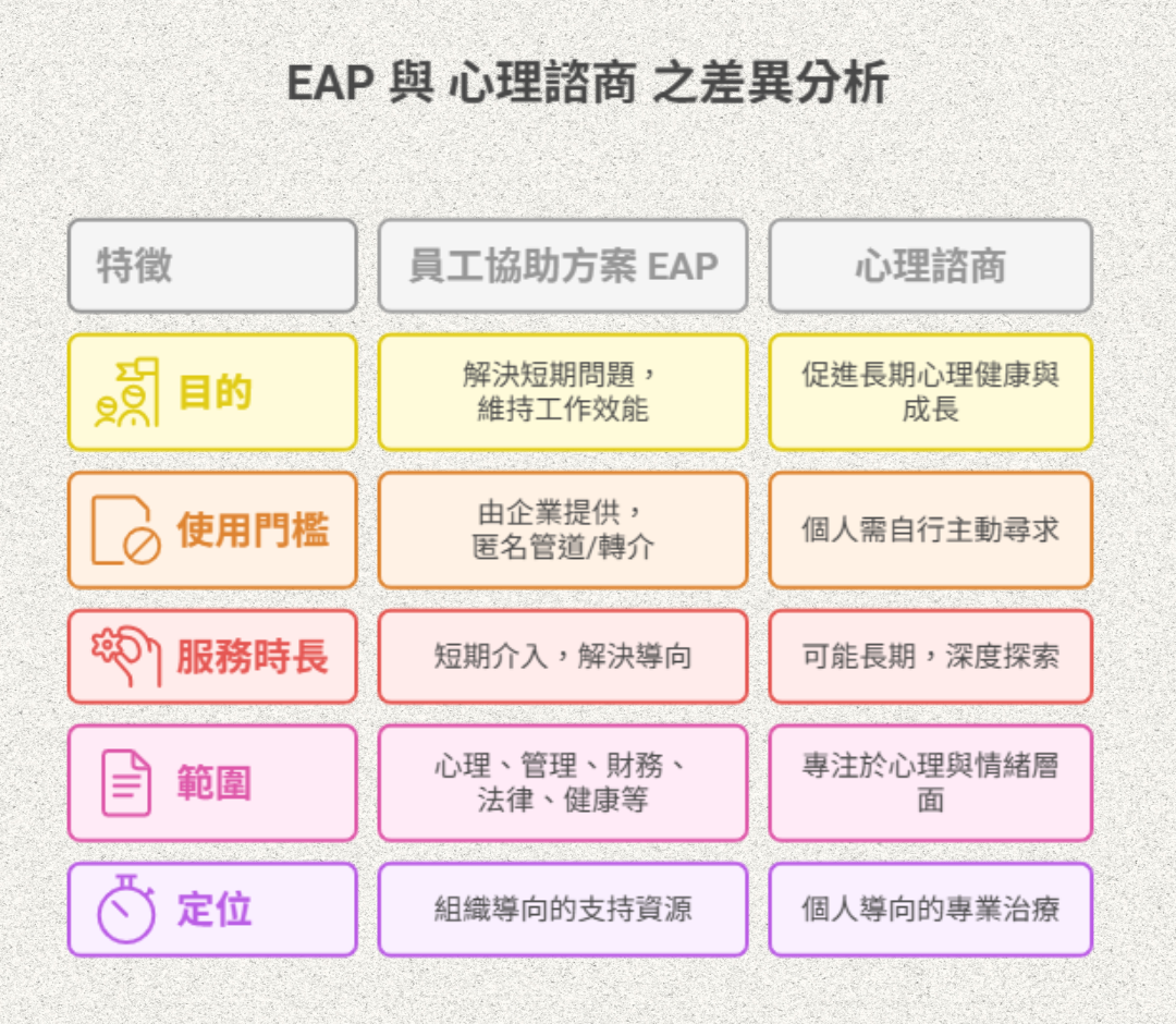 - EAP:著重「即時處理」與「危機緩解」。例如:員工因專案壓力失眠,EAP 會提供短期調整與生活建議,並在需要時轉介至專業心理師。
