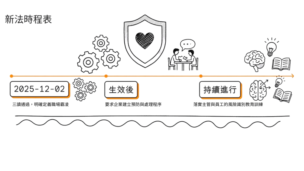 2025年12月2日三讀通過的《職業安全衛生法》修法中,新增「職場霸凌防治」專章,首次明確定義職場霸凌行為,並要求企業依事業單位規模與風險,訂定預防措施與處理機制。此修法不僅強化了雇主對心理危害的法律責任,也大幅提升企業在人才管理、內部通報、調查程序上的法遵門檻。