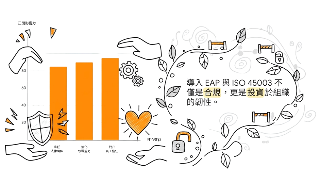 這份國際標準,提供明確架構與可行步驟,幫助企業從壓力來源開始拆解、從制度建立風險防線。若能搭配EAP,更能讓這套標準從紙本走進人心。